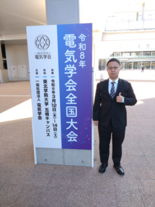 令和8年電気学会全国大会で猪野一将さんが発表しました。 2026年3月12日に、三枝・瀧川研究室の猪野一将さん(修士2年)が東北学院大学にて研究成果(※)を発表しました。 金属衝突によって生じる電波波形の金属種と気候の依存性を、実験により明らかにしました。学生最後の堂々とした発表で有終の美を飾りました。 (※) 猪野一将 他,金属衝突により生じる電波の波形解析:金属種と気候の依存性,電気学会全国大会,1-049.